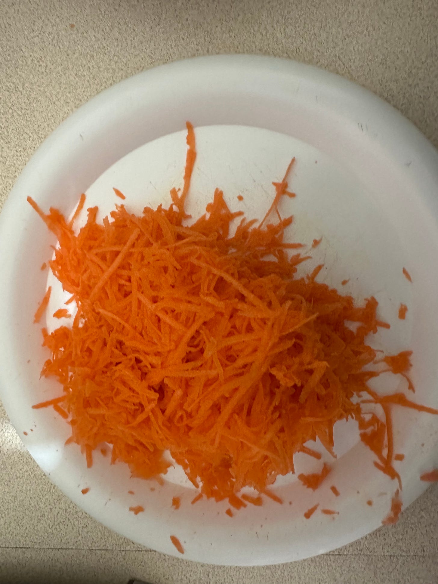 I put you on pause for one more second while I finish grating the carrots, we need to have about two cups of carrots that would be about two large carrots or I would say 3 medium, I'm doing three skinny medium okay? So I grate that unless you want to hear the grating? I'm not sure do you want the hear the grating or not I don't know. I would do it just a little bit the grating for you. I don't know why you would want this grating noise so I would not do anymore. Now I am not sure about you, but I like to use the finer grating holes to do the grating rather than the big ones. I don't know I just like it; it is much better for me.