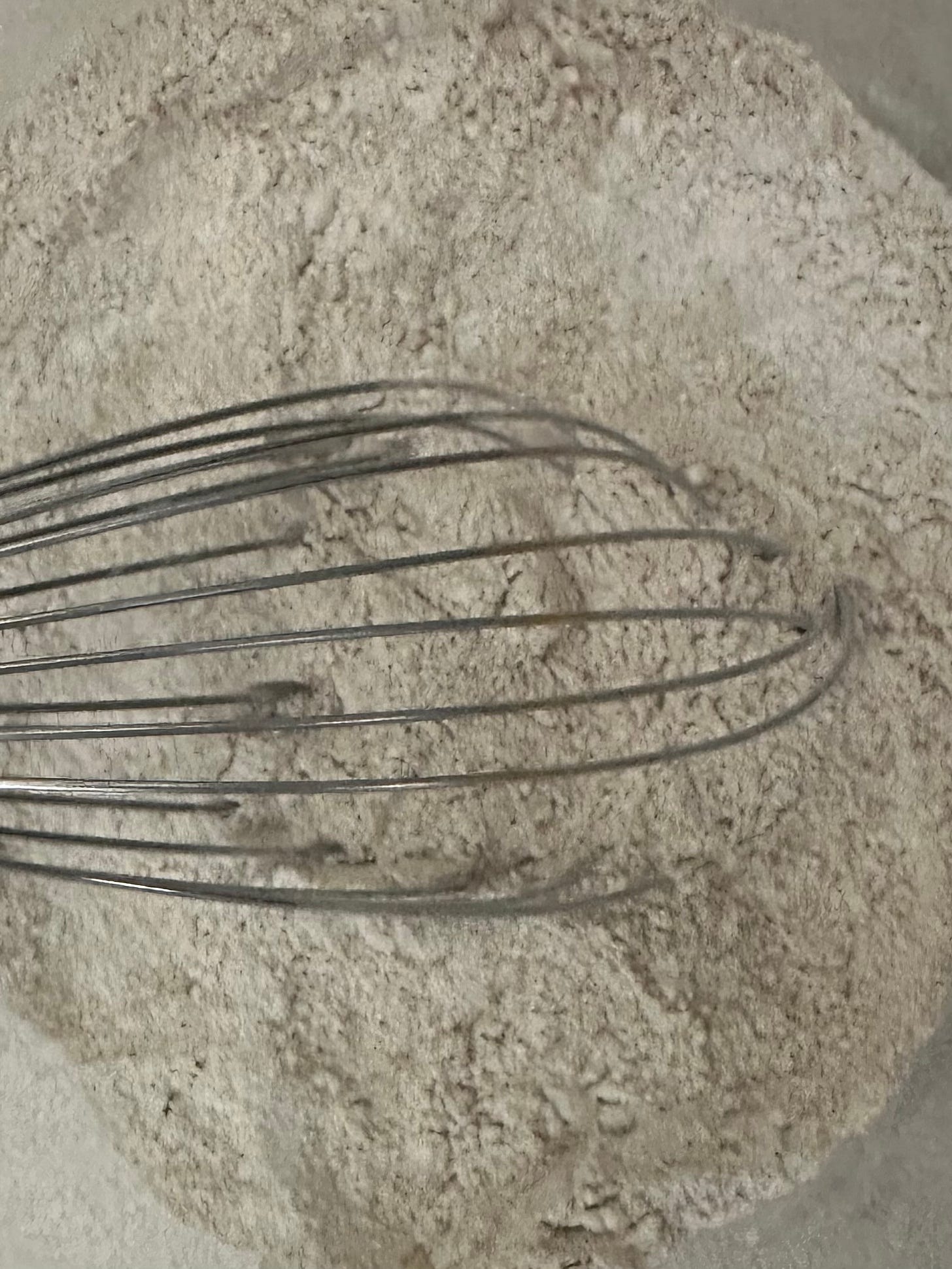 Then we use our whisk again, whisk, whisk, whisk, and just stir it around and around and mix it all up together. Next do you know what it is going to do? Ahh okay, I need to tell you something okay? Both recipes call for walnut. Walnut is not good for this body, ahh this body does not like walnut very much, it makes this body’s tongue get a little swollen, no anaphylactic, but it is no good, no good, so we don’t, we don’t do that. So, we can eat it, it’s just no good, okay?