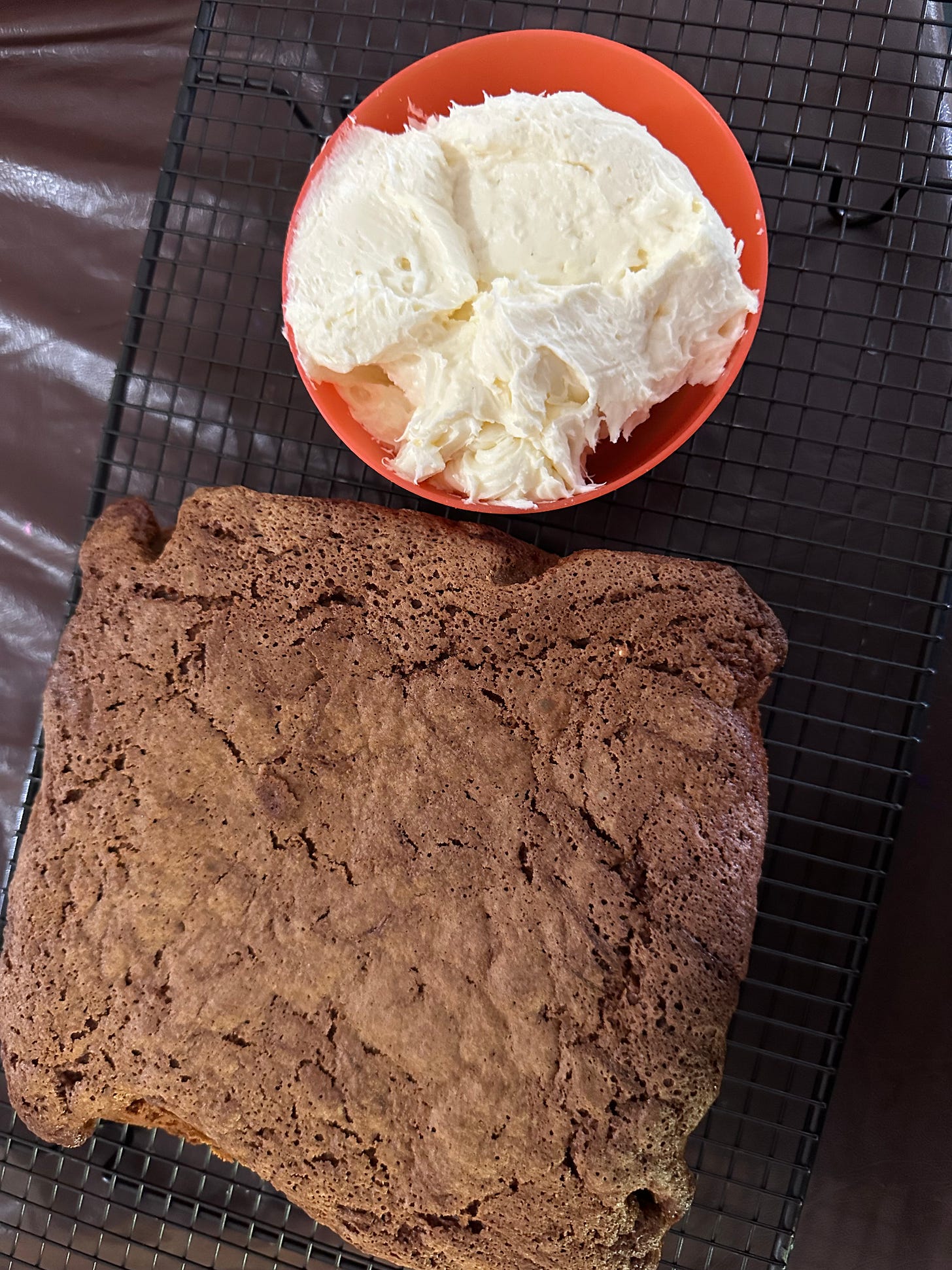 Okay, I need to let you, I have just come, just for a little minute, okay? It is days and days, very much days later. You see they forgot, I forgot and the next morning they had to make the cream cheese icing and there was no way I was going to come out here, with the family out here and just talk to you all. So, the other one here, they did that, and they were no talking so. I have come now so that I can add onto this the cream cheese icing, okay? And is going to be very small, very small and then I put it, I make another cake, but I will not tell you about the other cake because I already made the cake okay?
